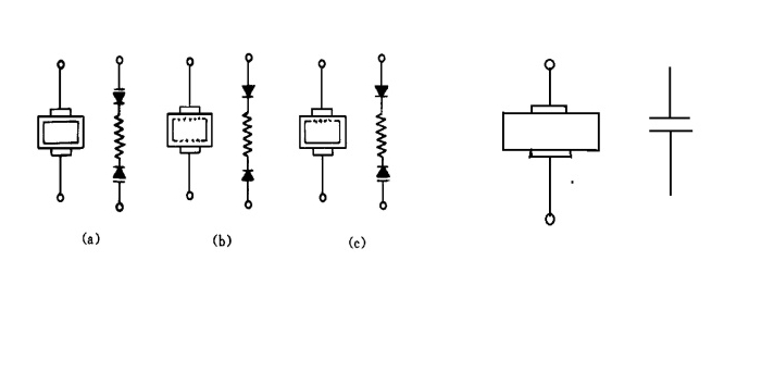 a为正常状态下的等效电路,其中上、下两个电容器代表上、下两个介质层的电容;两个箭头表示和N型半导瓷的接触状态;中间部分则表示半导体瓷中尚有一定的电阻。 b和c则分别表示两边或一边介质层被损坏后的不正常情况。介质层被损坏的程度不同则二极管的正、反电阻也不同,因此它并不意味着是一个常规的二极管。